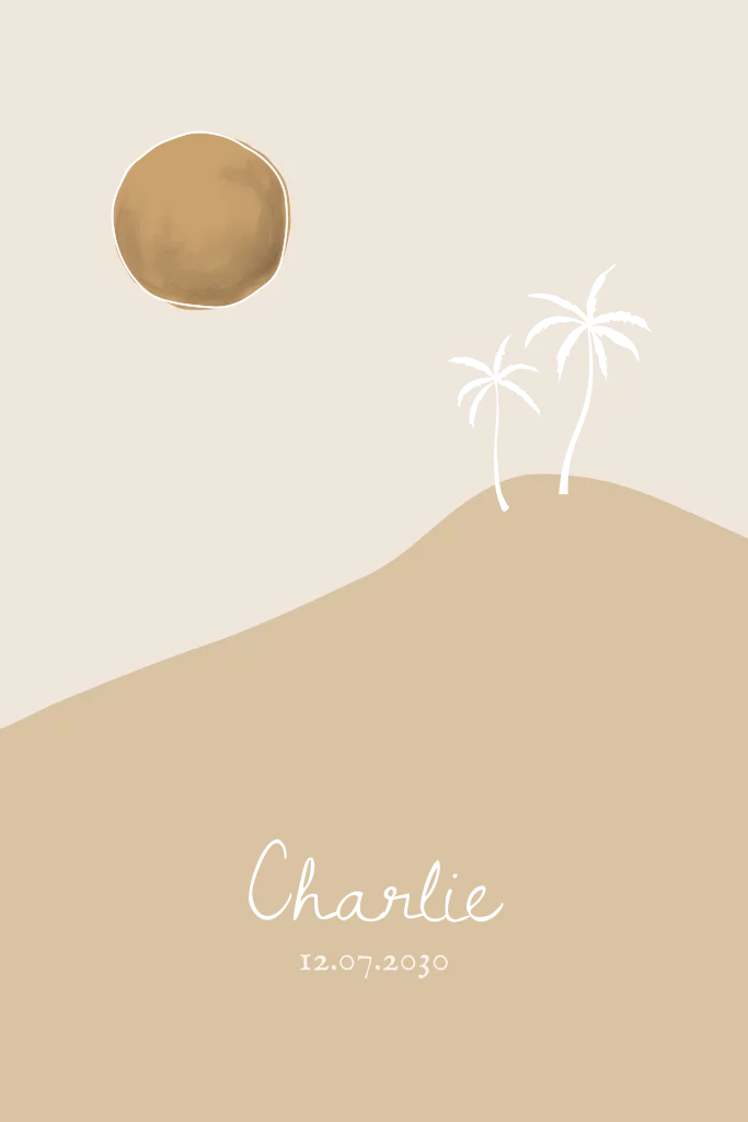 Neutraal staand geboortekaartje in beige kleuren met een berg, palmbomen en een volle maan