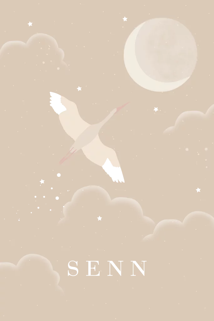Mooi geboortekaartje met vliegende ooievaar in beige kleuren in de wolken met een maan - de vleugels staan los van het lijfje van de ooievaar, dus zet eventueel de vleugels in een andere kleur. Pas de kleur achtergrond gemakkelijk aan in de editor. Hulp nodig? Wij helpen je altijd graag!