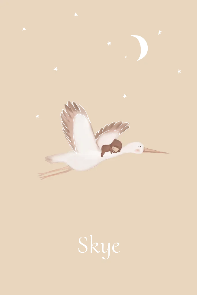 Lief geboortekaartje met handgetekende aquarel ooievaar en baby in berenpakje op de rug. De omlijning van de vleugels van de ooievaar worden gedrukt in goudfolie. Heb je vragen of kom je er niet zelf uit met bewerken van de kaart? Wij helpen je graag!