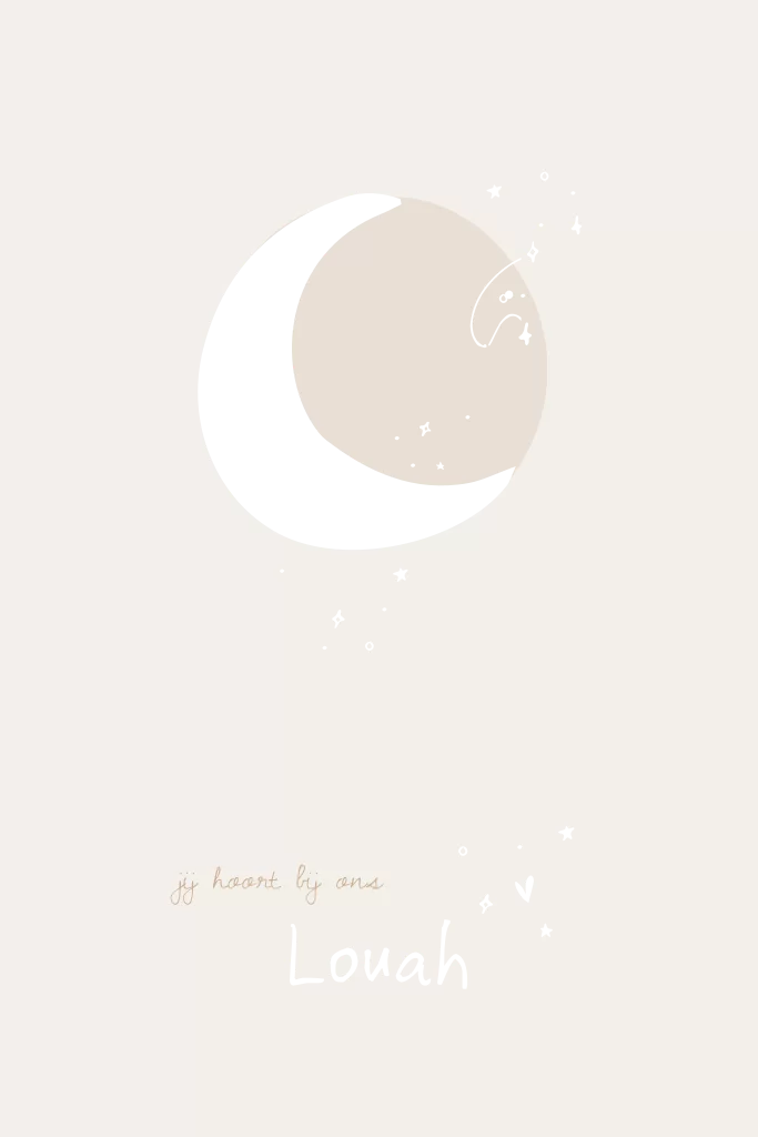 Geboortekaartje met speelse getekende maan en sterretjes in koperfolie. Pas de kleuren en/of folie gemakkelijk aan in de editor! Hulp nodig? Wij helpen je graag!
