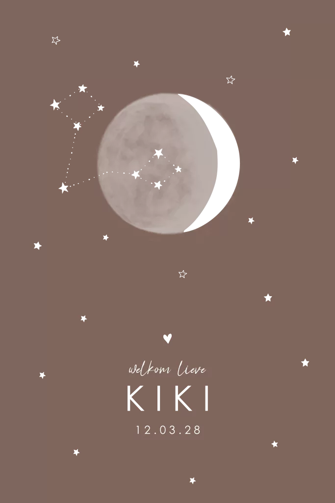 Geboortekaartje met veel sterren, maanfase en sterrenbeeld