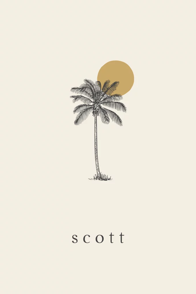 Mooi minimalistisch neutraal geboortekaartje met een handgetekende palmboom en opgaande of ondergaande zon. Pas de kleuren naar wens aan in de editor!