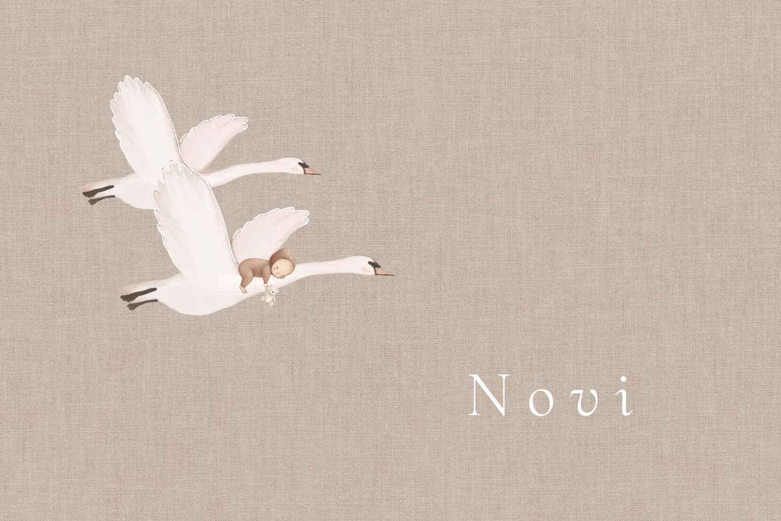 Prachtig linnenlook geboortekaartje met handgetekende aquarel vliegende zwanen met een zwaan met baby op de rug die ligt te slapen met een knuffelbeertje in de hand. Pas de gegevens gemakkelijk zelf aan in de handige editor. Kom je er niet uit of heb je vragen - wij helpen je altijd graag!