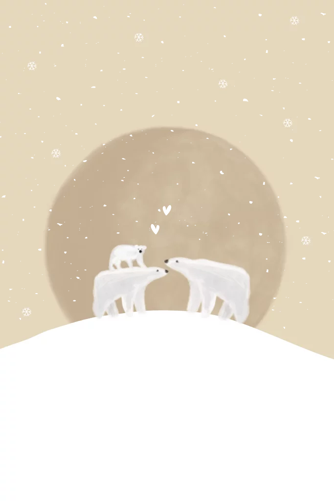 Mooi winters geboortekaartje met zandkleurige berglandschap met een ijsbeerfamilie in aquarel. Met een mooie volle maan op de achtergrond. Pas zelf gemakkelijk de kleuren van de bergen/achtergrond aan. Ander gezinssamenstelling? Kies uit de editor andere silhouette of lijntekeningen!