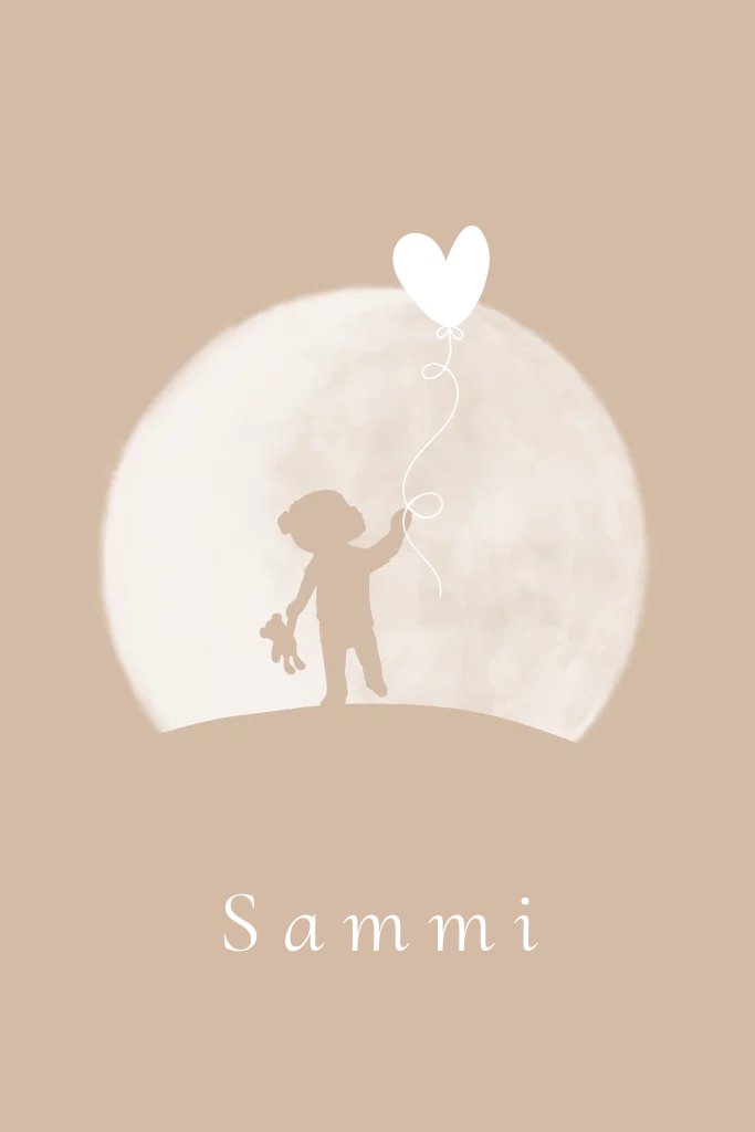 Mooi geboortekaartje met zandkleurige berglandschap met een silhouette van een kindje (meisje met knotje - zie de editor voor de jongensvariant) wat een hartjesballon vasthoudt met een mooie volle maan op de achtergrond. Pas zelf gemakkelijk de kleuren van de bergen/achtergrond aan. Kies uit de editor andere silhouette of lijntekeningen!