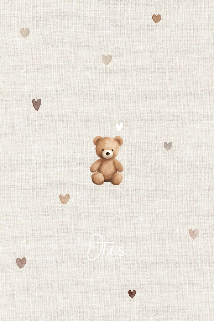 Een lief geboortekaartje met aquarel knuffelbeer en aquarel hartjes. 1 hartje boven het beertje en de naam zijn in goudfolie gedrukt. De mooie linnenlook achtergrond maakt het helemaal af. Kies bij het afdrukken voor Linnenpapier voor het mooiste kaartje!
