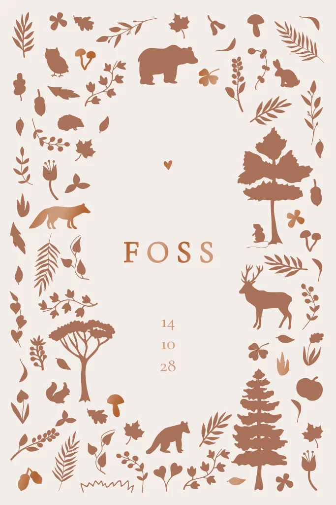 Mooi herfstthema geboortekaartje met bosdieren en boselementen in hoogglans koperkleur. Pas gemakkelijk de elementen met folie en/of kleuren zelf aan in de editor. Als je er niet uitkomt, stuur mij gerust een berichtje, ik help je graag!