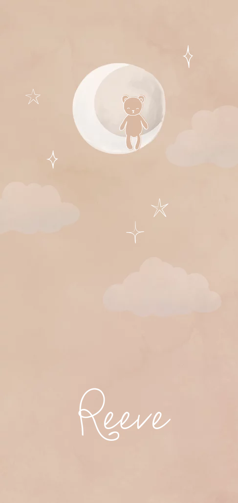 Lief geboortekaartje met maan sterren en beertje op maan. De sterren, omlijning van het beertje en de babynaam worden gedrukt in goudfolie.