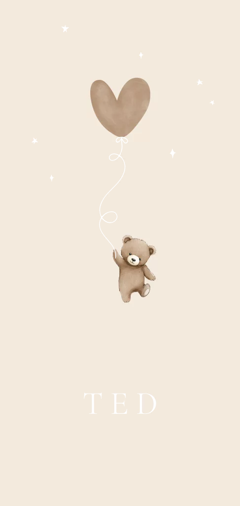 Lief langwerpig geboortekaartje met een knuffelbeertje/ teddybeertje aan een touwtje van een hartjesballon. Het touwtje van de ballon wordt in goudfolie gedrukt, net zoals de naam. Heb je hulp nodig of heb je vragen, stuur een berichtje en wij helpen je graag!