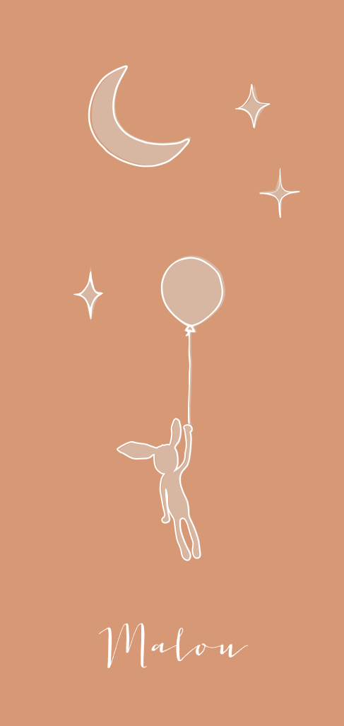 Een mooi neutraal geboortekaartje met een knuffelkonijn die een ballon vast heeft. De babynaam en de lijnen rondom de knuffel, de ballon, maan en sterren worden gedrukt in goudfolie.