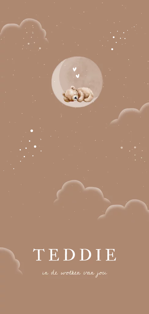Superlief geboortekaartje met een slapende teddybeer op de maan in de wolken met sterretjes in goudfolie. Pas gemakkelijk de achtergrondkleur aan in jouw favoriete kleur. Hulp nodig met opmaken of wil je een ander formaat kaart? Wij passen het allemaal gratis voor je aan!