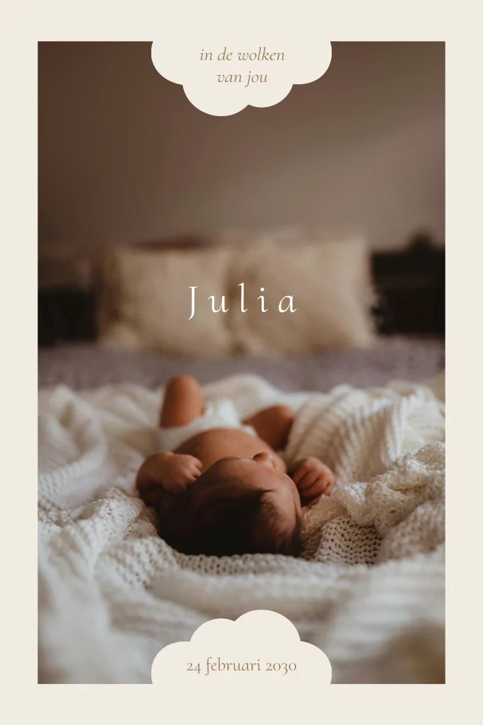 Lief bijzonder fotogeboortekaartje met wolkjes. Let op: dit is een budgetvariant van de inschuif labelkaart met wolkjes (Instagram). Pas gemakkelijk de foto aan naar een foto van jouw/jullie eigen kindje. TIP: met folie bestel deze op linnenpapier, zonder folie op Tintoretto papier.