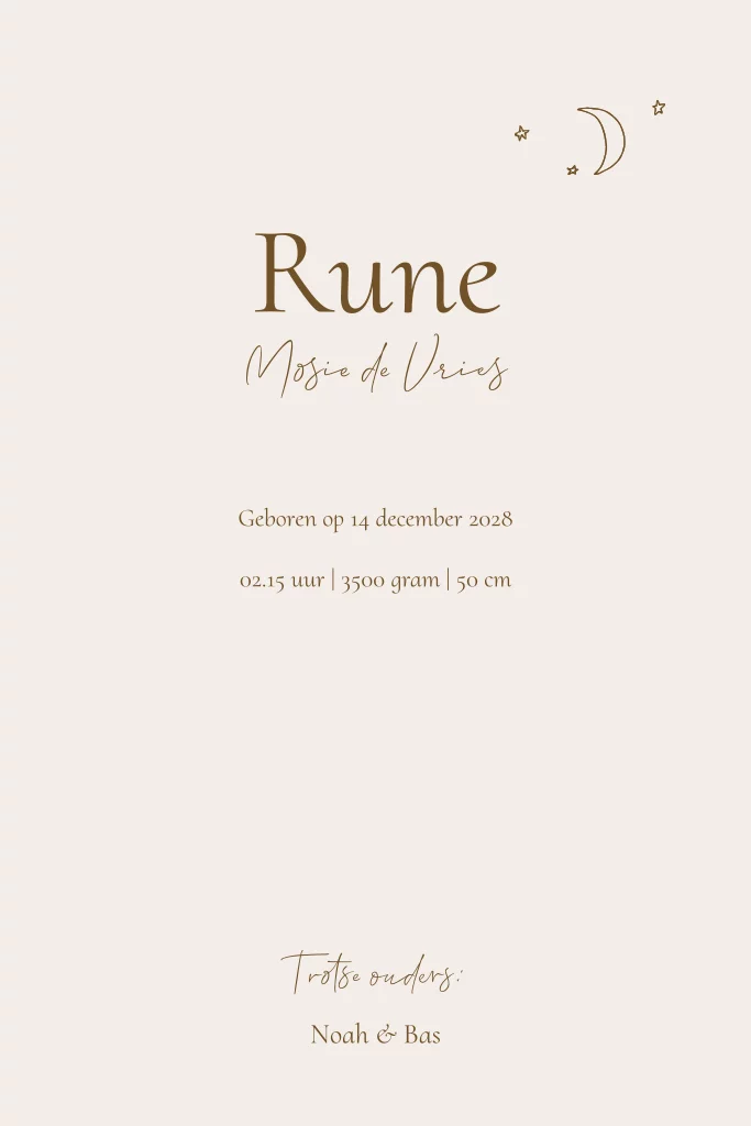 Een lief herfst geboortekaartje met beertje die kijkt naar de maan. De lijntekeningen worden gedrukt in goudfolie. Liever een andere kleur of folie? Personaliseer en bewerk het kaartje eenvoudig zelf in de editor. Mocht je er niet uitkomen of heb je andere vragen, stuur mij dan een berichtje, ik help je graag!