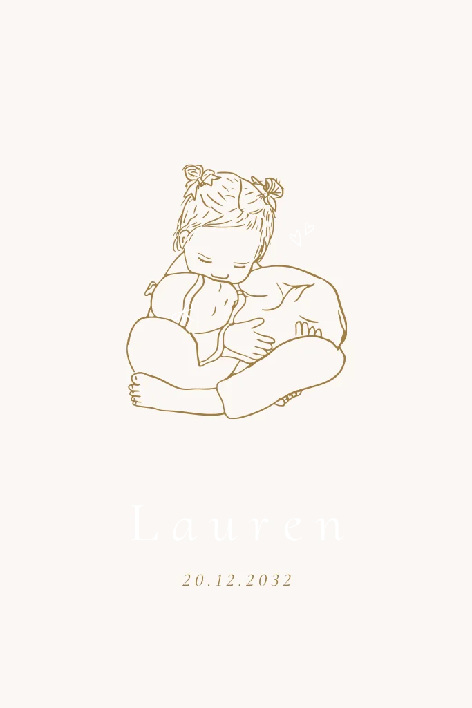 Leuk geboortekaartje met een unieke lijntekening van grote broer of zus (kijk in de online editor onder het kopje 'lijntekening gezin-broertje-zusje' voor meer lijntekeningen. Pas gemakkelijk de lijntekening aan in de editor naar jouw kindje - heeft jouw kindje ander haar oid, laat het ons weten en wij passen het gratis voor je aan. Let op: de folie staat nu aan voor de naam, strikje bij de baby en de 2 hartjes.