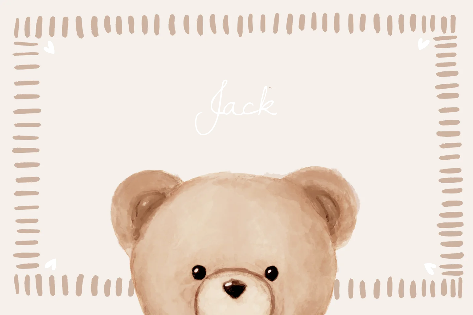 Stoer en leuk geboortekaartje met een handgetekend aquarel teddybeertje kijkend over de rand met een leuke trendy streepjes rand - bekijk andere leuke frames in de editor. Wil je deze kaart in een ander formaat, vorm of dubbele kaart? Stuur ons vrijblijvend een berichtje en wij passen het gratis en snel aan voor je!