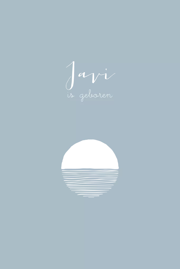 Een minimalistisch geboortekaartje in een zachte blauwe kleur met een ondergaande zon in zee die in koperfolie wordt gedrukt.