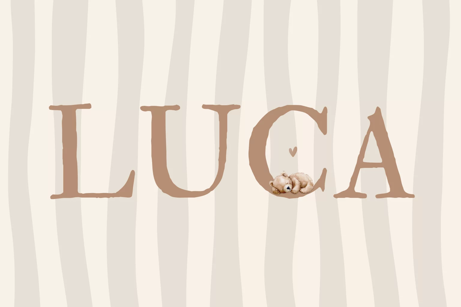 Een speels en minimalistisch geboortekaartje met een aquarel knuffelbeertje slapend op 1 van de letters van de naam. Het hartje bij het beertje wordt gedrukt in hoogglans. Pas gemakkelijk de naam aan van jouw kindje en verplaats de knuffelbeer waar je wilt. Liever andere kleuren of een andere kleur folie? Pas het gemakkelijk aan in de editor.