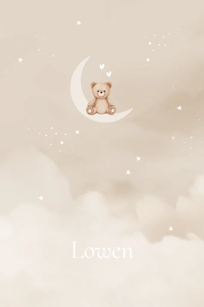Lief geboortekaartje met een aquarel teddybeertje wat op de maan zit. Met mooie goudfolie sterretjes en hartjes. Pas de achtergrondkleur gemakkelijk aan in de editor. Heb je hulp nodig? Wij helpen je graag!