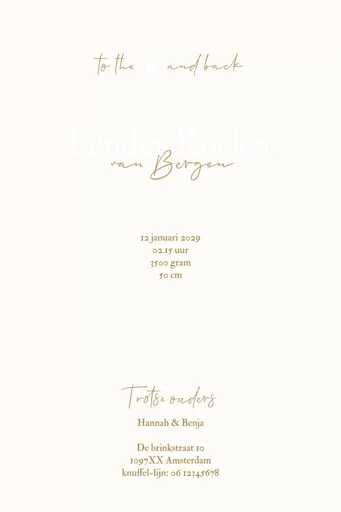 Prachtig geboortekaartje in beige achtergrond met een vliegende kraanvogel voor een volle maan en goudfolie vleugels.