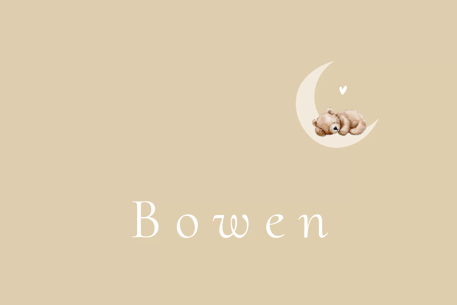 Een minimalistisch speels geboortekaartje met een aquarel knuffelbeertje slapend de maan, het hartje bij de maan en de naam worden gedrukt in goudfolie. Pas gemakkelijk de naam aan van jouw kindje. Liever andere kleuren of een mooie folie of andere hoogglanskleuren? Pas het gemakkelijk aan in de editor.