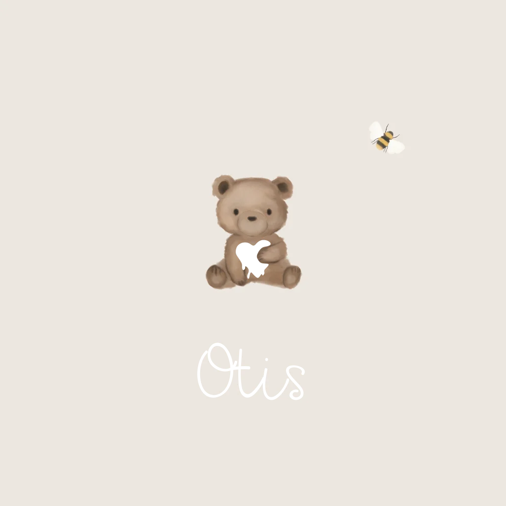 Lief geboortekaartje met een knuffelbeertje/teddybeertje met een folie honinghartje in zijn hand en een vliegend aquarel bijtje. Pas in de editor gemakkelijk de kleuren en/of illustraties aan. Heb je hulp nodig of heb je vragen, stuur ons vrijblijvend een berichtje:)