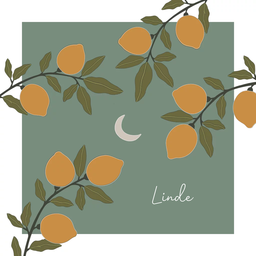 Dit geboortekaartje komt uit de collectie Happy Colors. De belijning van de citroenbomen, maantje en babynaam worden gedrukt in goudfolie.