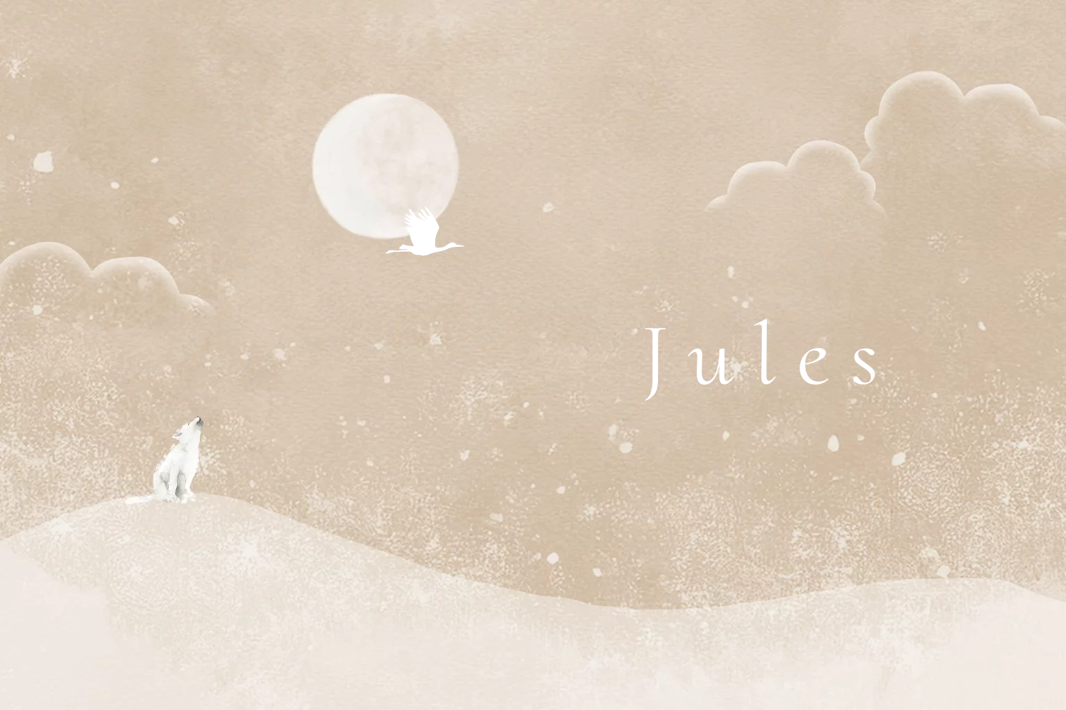 Winter geboortekaartje baby wolfje sneeuw maan berg beige goudfolie