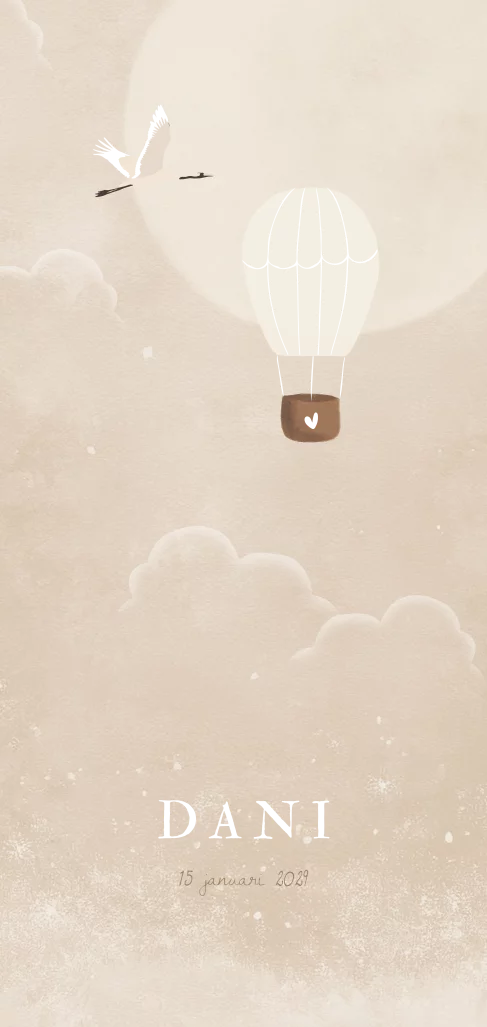 Mooi winters geboortekaartje in een langwerpige staande vorm met een luchtballon in de aqaurel wolken en sneeuw. De details van de luchtballon, de vleugels van de kraanvogel, het hartje op het mandje en sterretjes worden gedrukt in goudfolie. Hulp nodig met opmaken of heb je vragen? Wij helpen je graag!