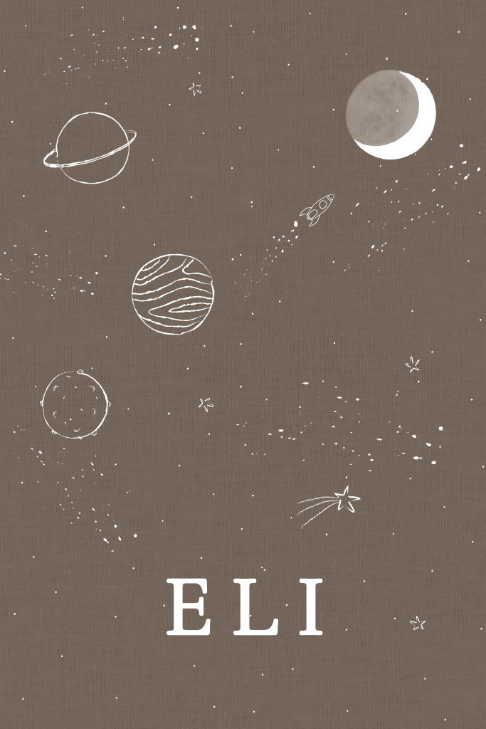 Prachtig goudfolie geboortekaartje met handgetekende planeten, maan, sterren, vallende ster. De voorkant in zijn geheel in goudfolie gedrukt, wat een supergaaf 3D effect geeft aan het geboortekaartje. Pas de achtergrondkleur en/of folie naar smaak en wens aan!