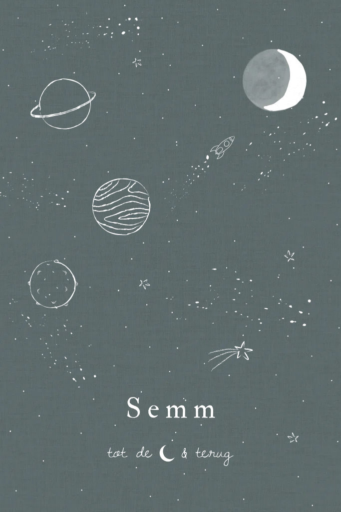 Prachtig goudfolie geboortekaartje met handgetekende planeten, maan, sterren, vallende ster. De voorkant in zijn geheel in goudfolie gedrukt, wat een supergaaf 3D effect geeft aan het geboortekaartje. Pas de achtergrondkleur en/of folie naar smaak en wens aan!