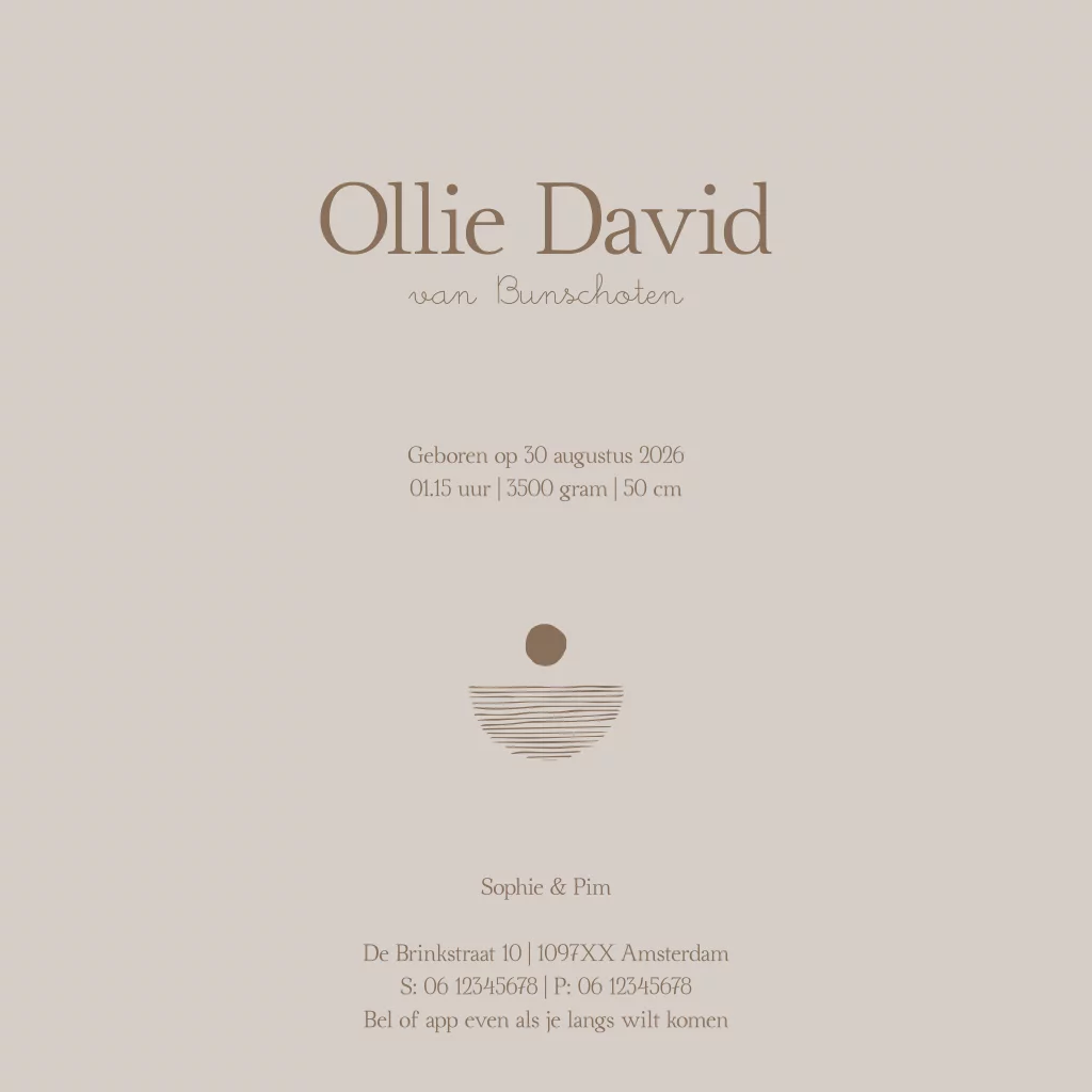 Mooi minimalistisch geboortekaartje met een mooi zee thema. De zee strepen en zon met naam worden in goudfolie gedrukt. Heb je hulp nodig met opmaken of wil je een enkele kaart of ander formaat kaart? Laat het ons weten, wij helpen je graag verder!