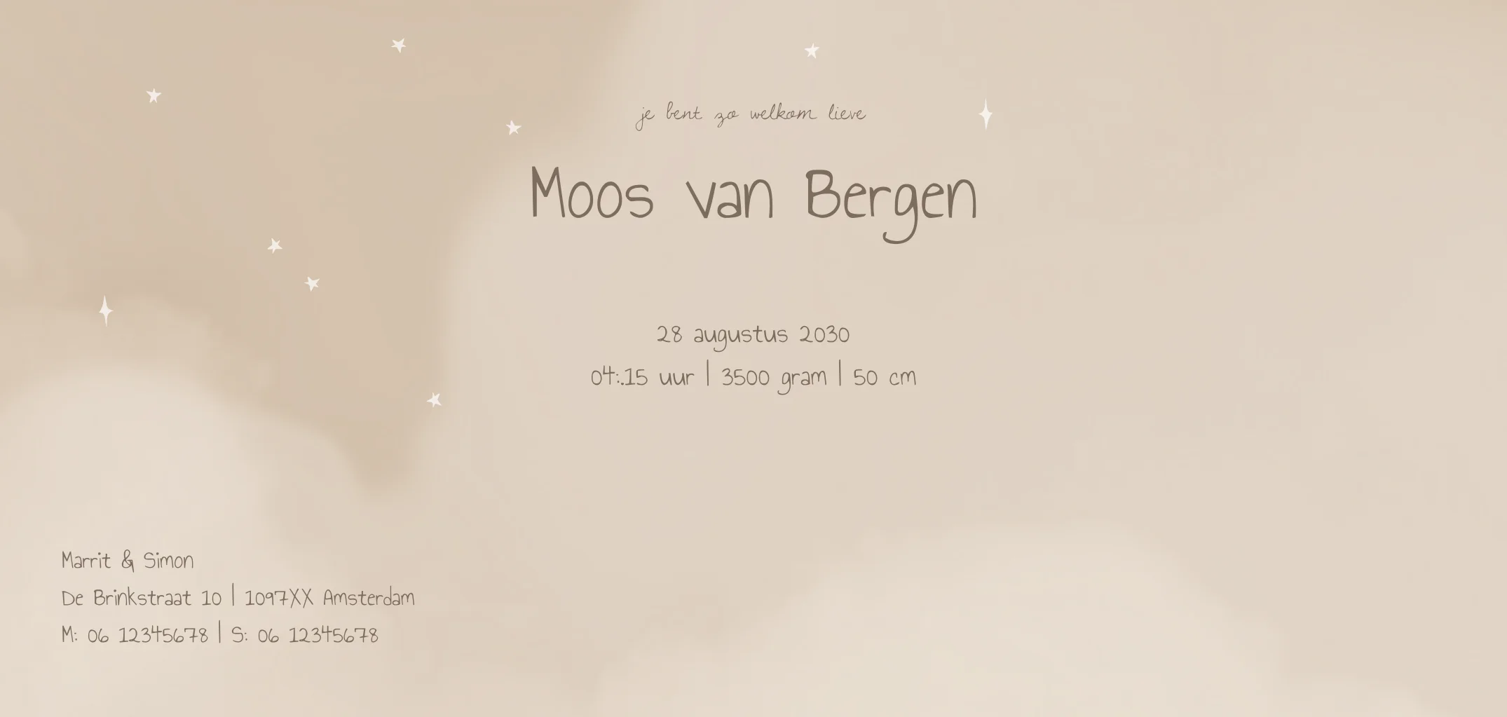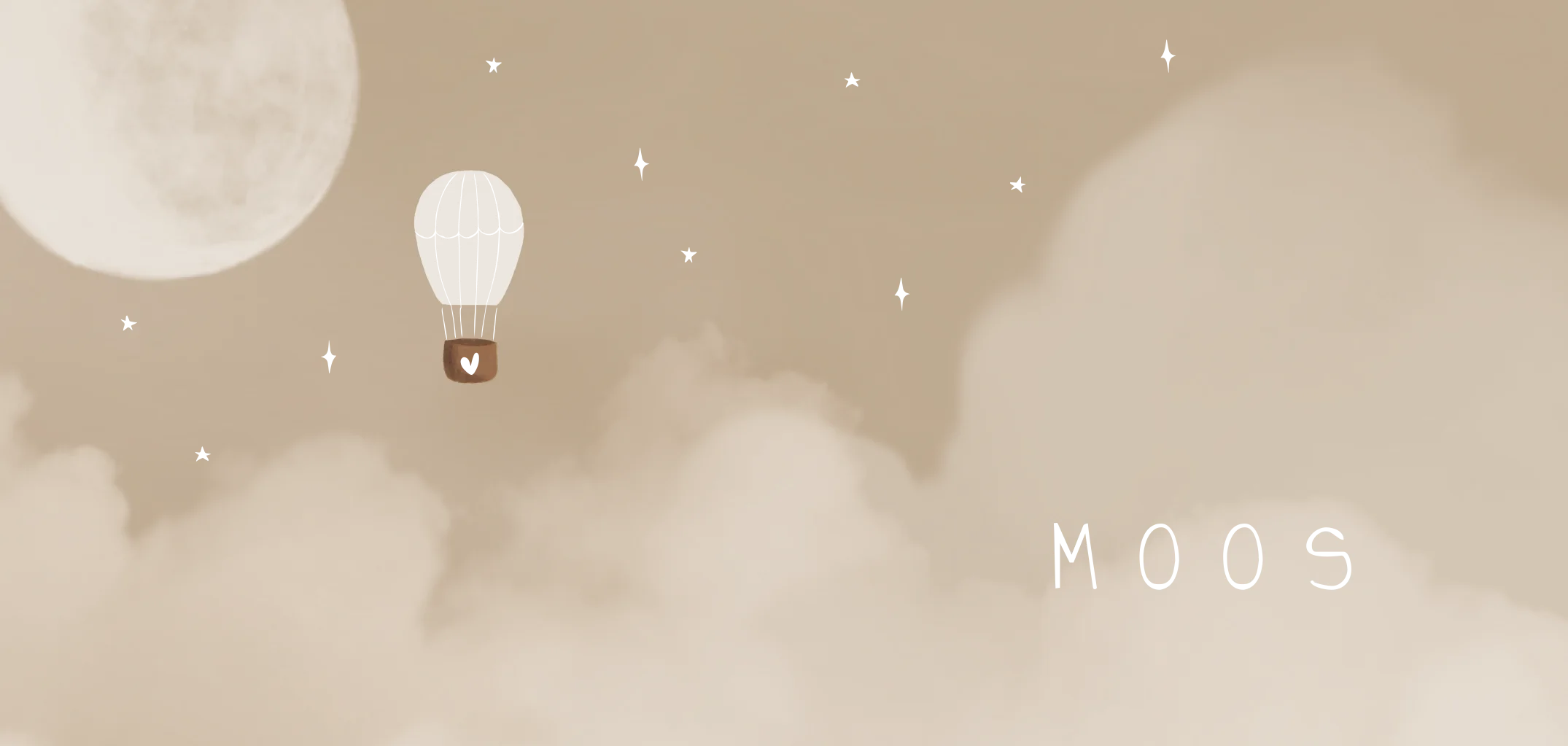 Dubbele openslaande panorama geboortekaartje met wolken, een luchtballon en volle maan met goudfolie details. // MOOS