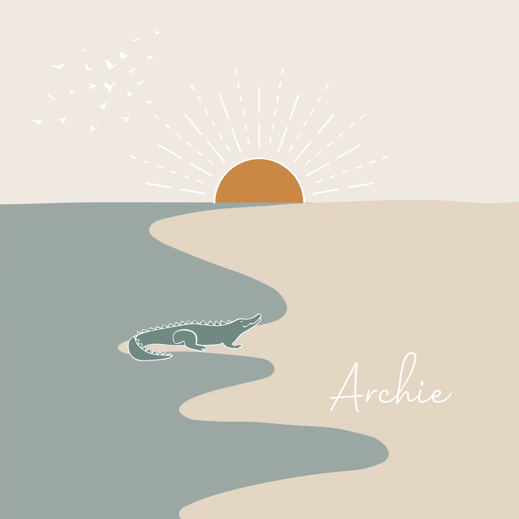 Geboortekaartje met strand, zee, ondergaande zon en krokodil