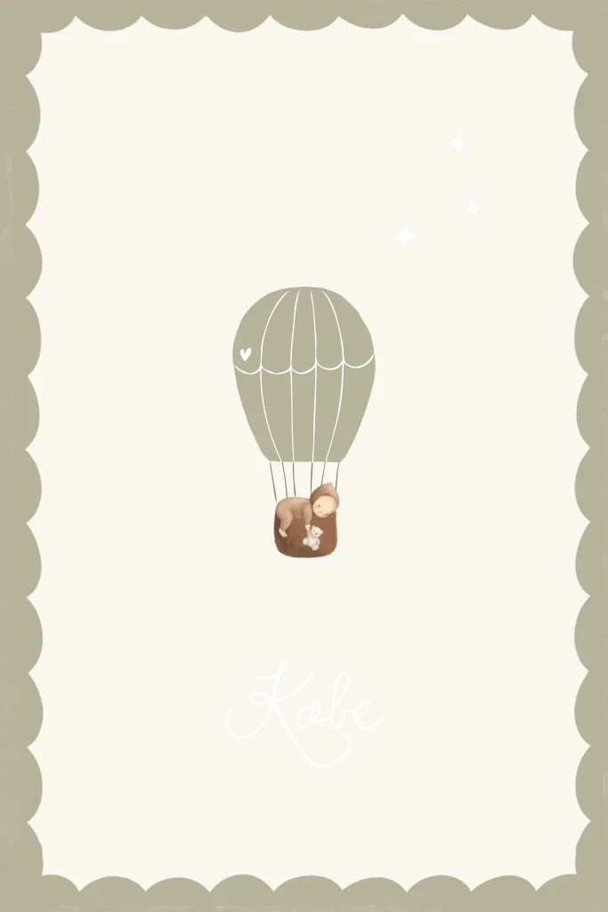Een stoer en lief geboortekaartje tegelijk met een mooie luchtballon en een baby slapend in de luchtballon. De babynaam en touwen van de luchtballon worden gedrukt in goudfolie.