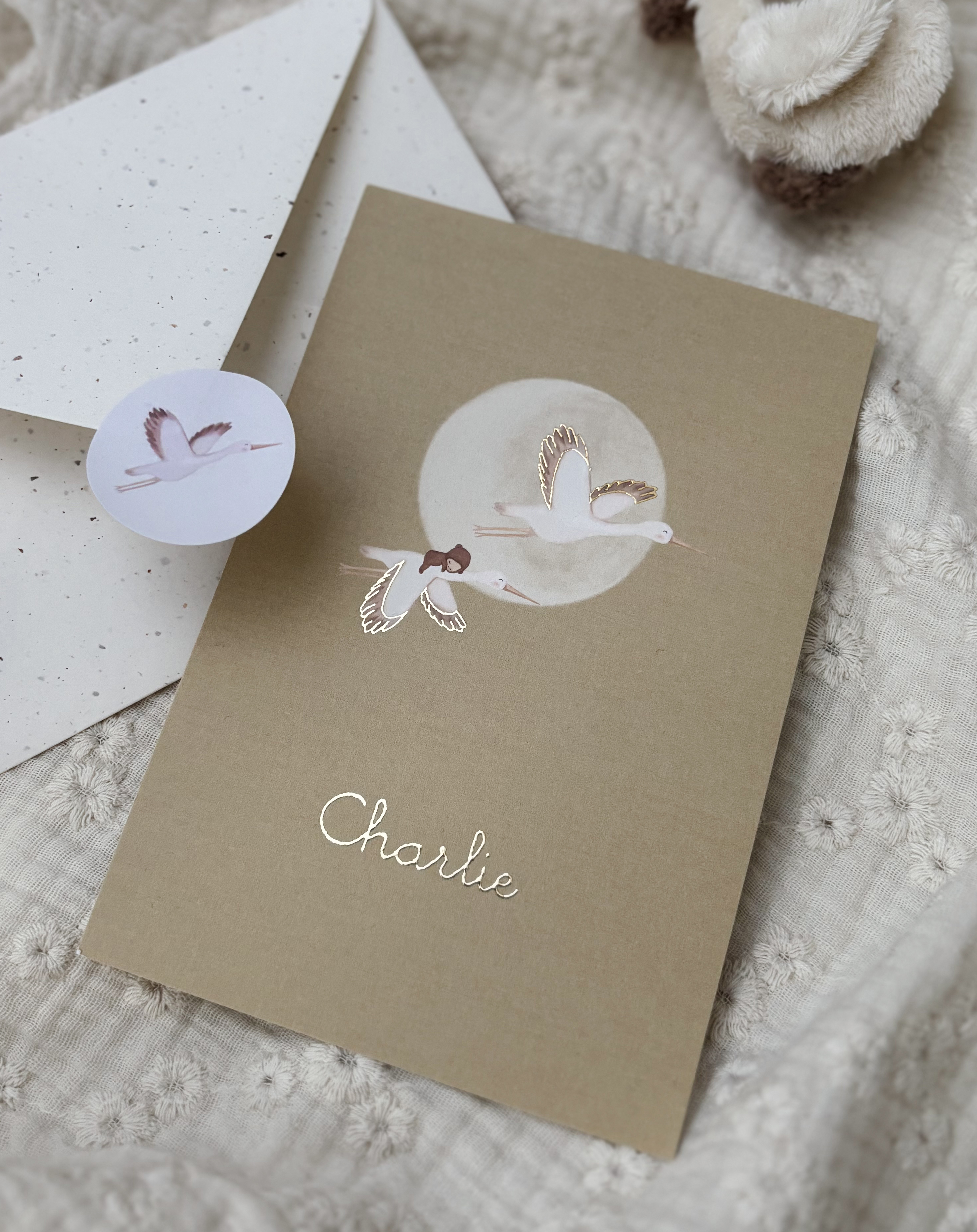 Geboortekaartje handgetekend ooievaars maan folie vleugels
