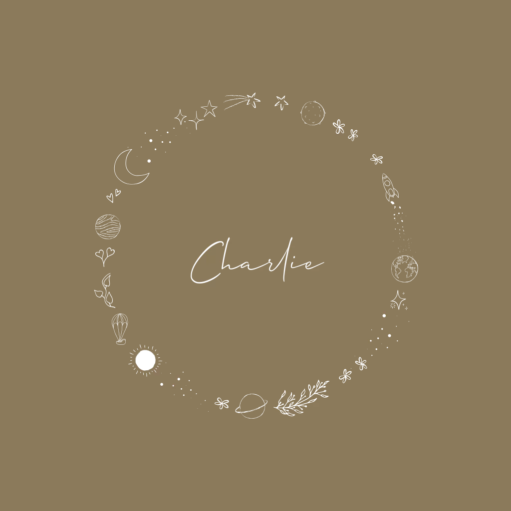 Geboortekaartje met handgetekende tekeningen met planetenthema/ruimte in rond en goudfolie. Elke afbeelding is apart, dus gemakkelijk te wijzigen naar smaak en om er helemaal persoonlijk kaartje van te maken! (Bij hulp staan we altijd voor je klaar).