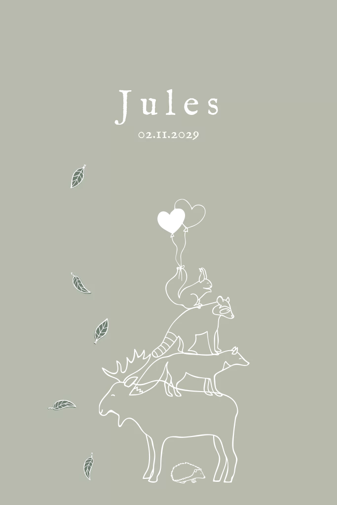Een geboortekaartje voor een herfstkindje met een eland, vos, wasbeer, eekhoorn en egeltje met een hartjesballon en blaadjes. De babynaam, hartjesballon en de lijnen van de blaadjes worden gedrukt in koperfolie. Je kunt altijd de kleuren aanpassen in de handige editor. Heb je vragen of wil je de kaart in een ander formaat? Stuur gerust een berichtje, ik help je graag!