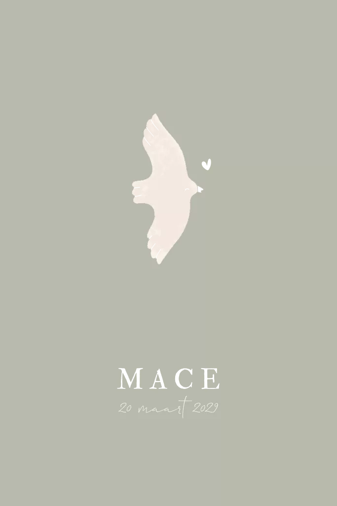 Minimalistisch mooi geboortekaartje met aquarel watercolor vogel met goudfolie details en hartje. Pas eenvoudig kleuren en/of folie aan in de handige editor!