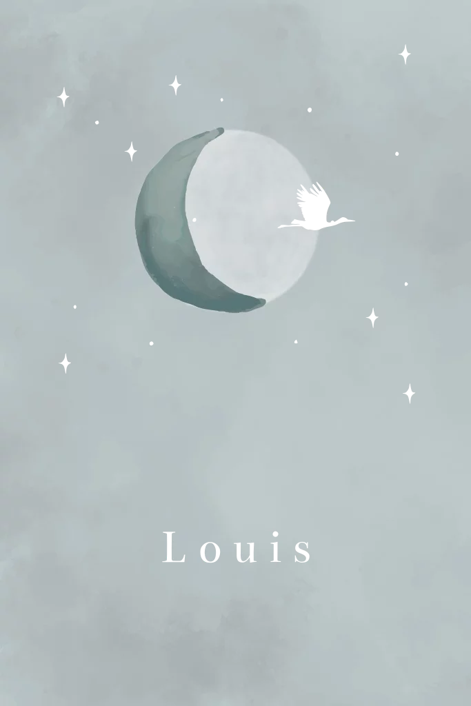 Geboortekaartje jongen met maan sterren ooievaar goudfolie. Pas de folie en/of kleuren gemakkelijk aan in de handige editor. Hulp nodig? Wij staan voor je klaar!