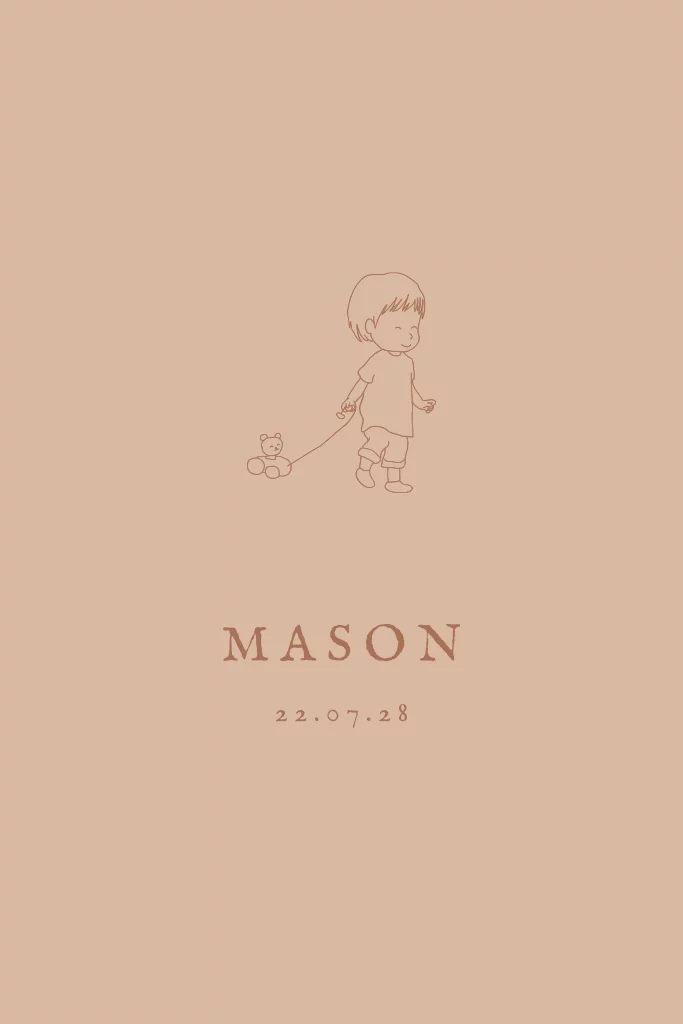 Minimalistisch geboortekaartje met een jongetje die een knuffeldiertje aan een lijntje heeft.