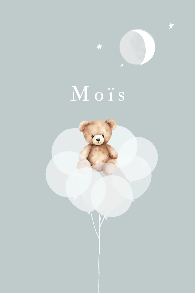 Geboortekaartje met een lief knuffelbeertje op ballonnen en een maan met sterretjes in goudfolie.