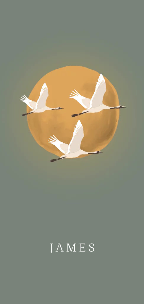 Mooi langwerpig geboortekaartje met een vliegende kraanvogel familie. De vleugels van de kraanvogels zijn gedukt in goudfolie. Pas gemakkelijk de kleuren aan naar wens in de online editor.