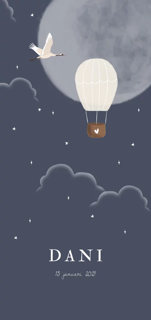Mooi geboortekaartje in een langwerpige staande vorm met een luchtballon in de aqaurel wolken. De details van de luchtballon, de vleugels van de kraanvogel, het hartje op het mandje en sterretjes worden gedrukt in zilverfolie. Hulp nodig met opmaken of heb je vragen? Wij helpen je graag!