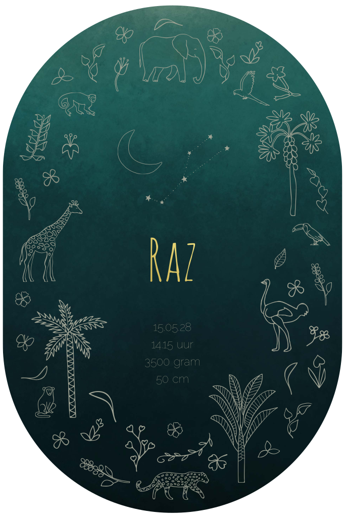 Geboortekaartje in een bijzondere ovaalvorm met lijntekening van safari dieren, bloemen, bomen en planten. De babynaam wordt in goufolie gedrukt. Liever andere kleuren of een andere kleur folie? Pas het gemakkelijk aan in de editor.
