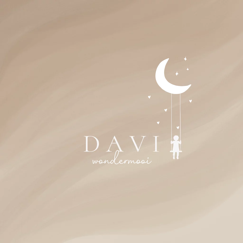 Geboortekaartje met maan en kindje op schommel met hartjes in goudfolie.