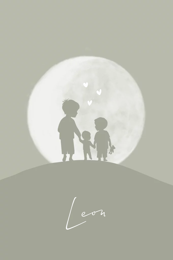 Mooi geboortekaartje met mooie groen kleuren berglandschap met een silhouette van een broers en broertje met een mooie volle maan op de achtergrond. Pas zelf gemakkelijk de kleuren van de bergen/achtergrond aan. Ander gezinssamenstelling? Kies uit de editor andere silhouette of lijntekeningen!
