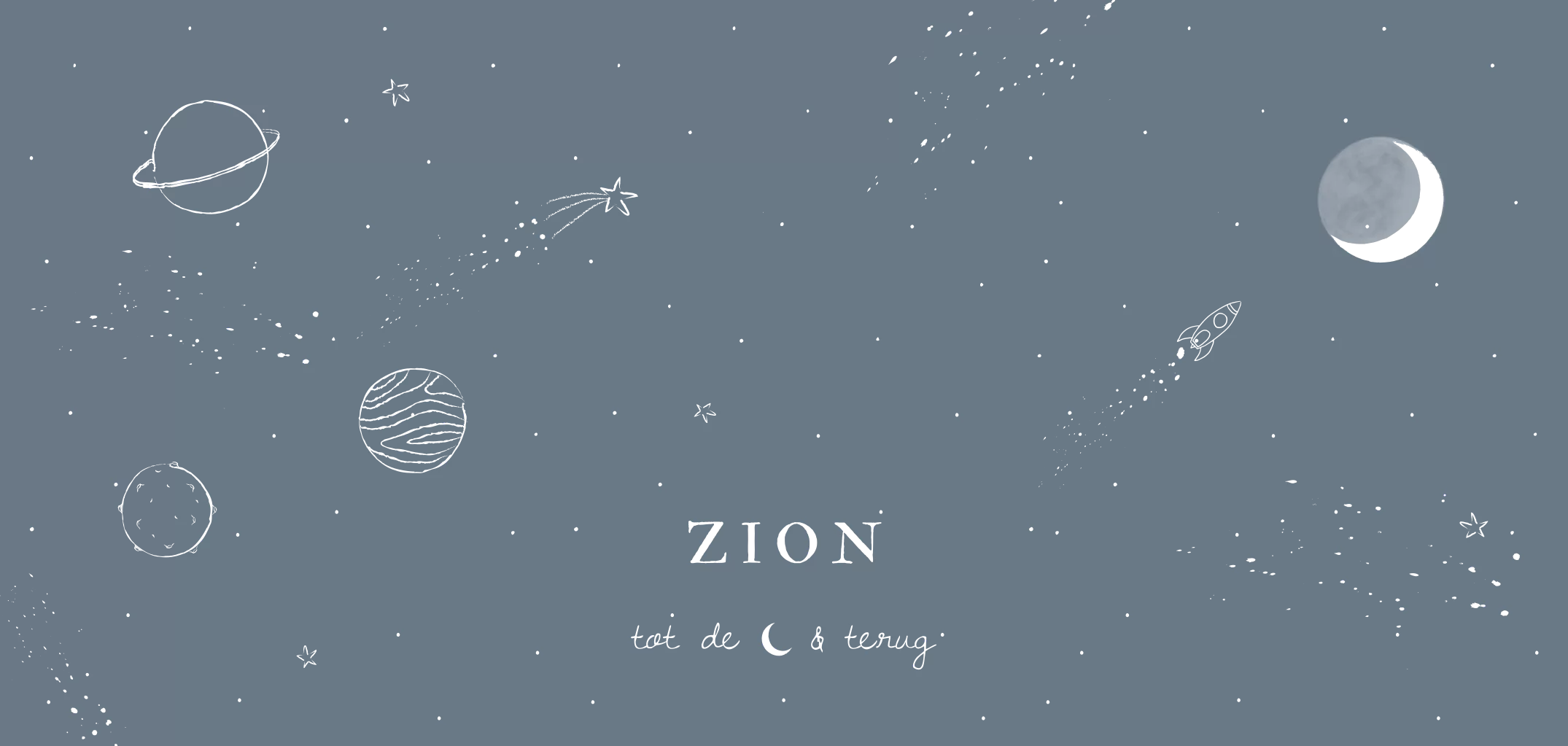 Een prachtig handgetekend geboortekaartje met planeten, maan, sterrenhemel, sterren, vallende ster en een raket. Tot de maan en terug. Lieve mooie details in zilverfolie.