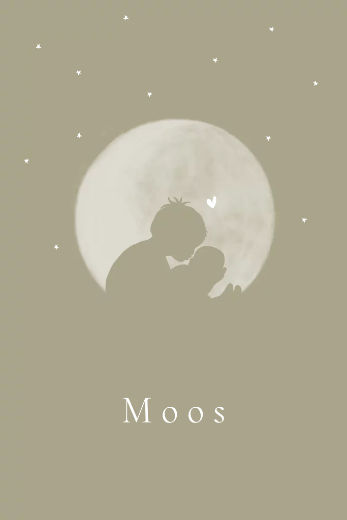 Lief en stoer geboortekaartje met een silhouette van een grote broer die een baby vasthoud op schoot en een kusje geeft. Met als details de kleine sterretjes in goudfolie. Pas de kleuren en/of gegevens gemakkelijk aan in de handige online editor. Voor hulp en vragen kun je altijd een berichtje sturen - wij helpen je graag!