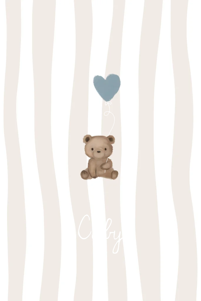 Heel gaaf, dit leuke streepjes geboortekaartje met een illustratie van een aquarel knuffelbeertje en hartjesballon met als touwtje in folie gedrukt. Pas gemakkelijk de kleur folie, achtergrond en/of hartje naar wens en smaak aan, heb je hulp nodig of vragen - wij helpen je graag!