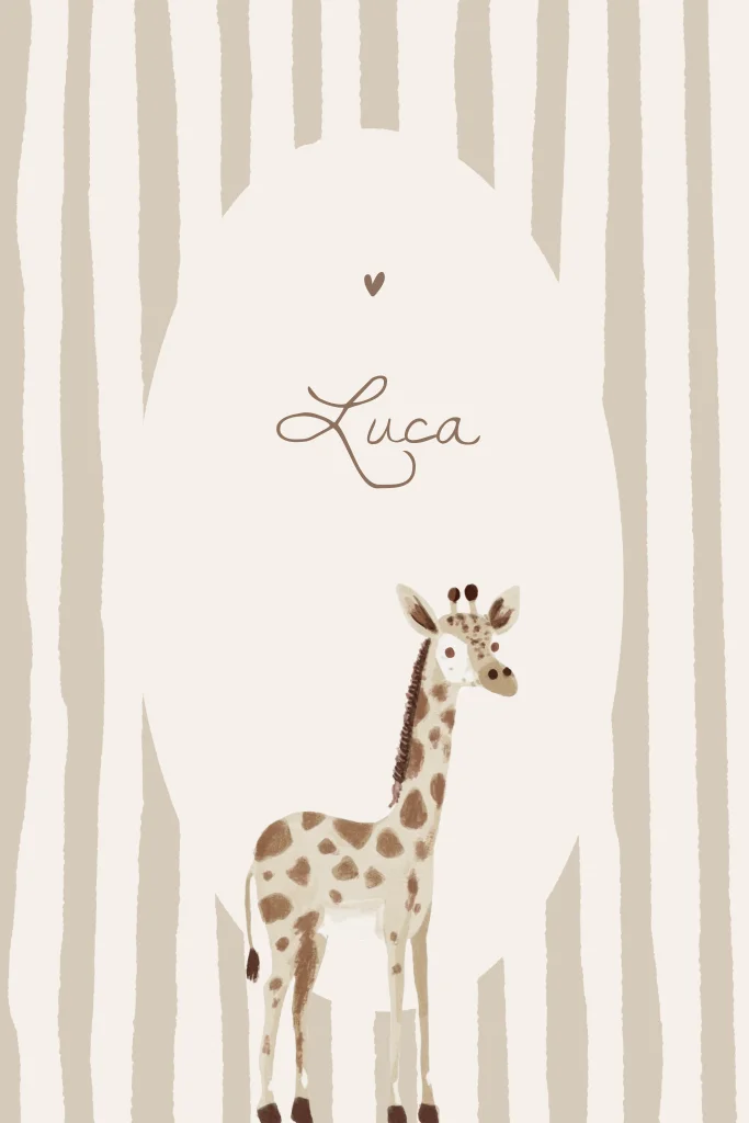 Geboortekaartje met een hip en trendy streepjes patroon aan de rand met een aquarel handgetekende giraf. Liever een dubbele kaart of een andere vorm kaart of heb je hulp nodig met opmaken? Stuur een berichtje, wij helpen je graag verder!
